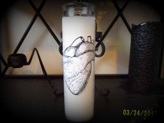 8 inch tall prayer style candle. Unscented, white. Decoupaged human heart on the front. Burns great, adds extra "creepy" to your home!! Hand made! Thanks for looking!!