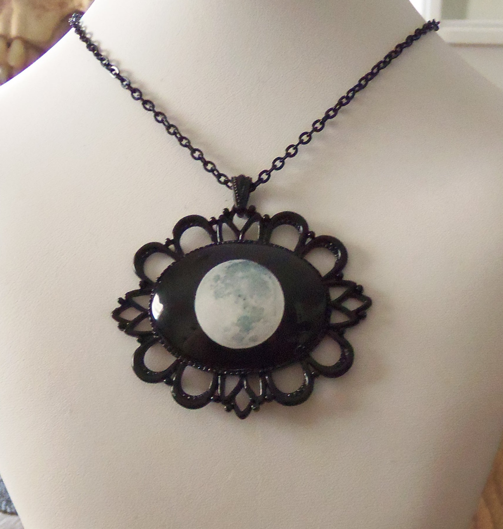 A full moon photo under a glass cab, in a sturdy metal setting. Comes on a 20 inch black chain. Hand made! Thanks for looking!!